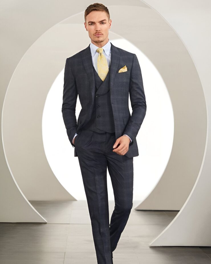 The mild yellow neckties and matching pocket squares are the right style enhancers for this attire.