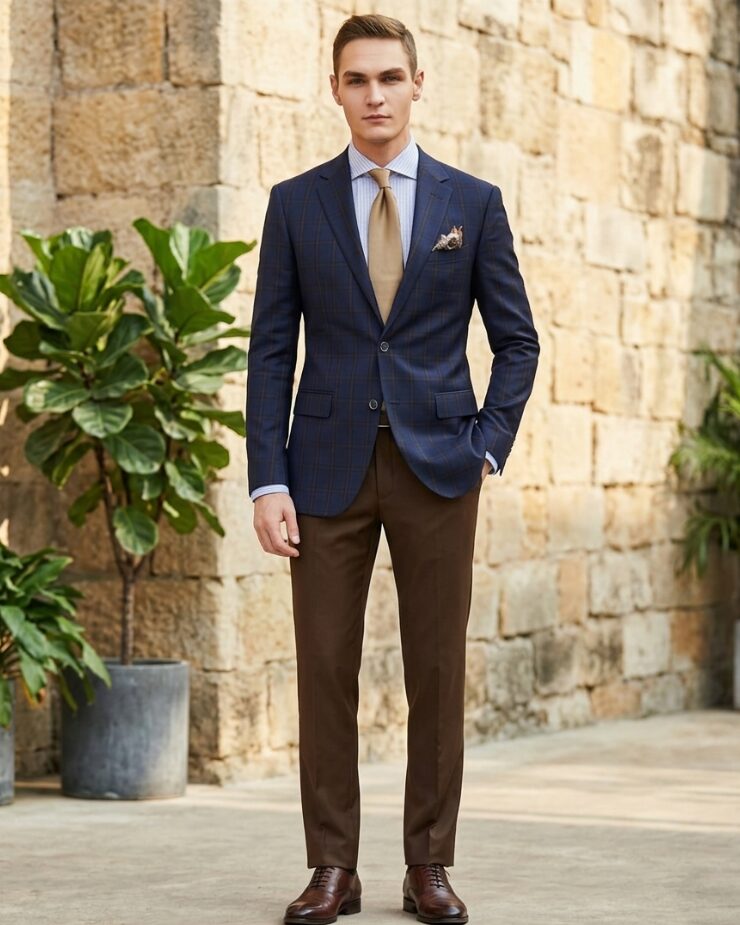 The model wears a structured, well-tailored, chic formal suit in navy blue, brown, and golden hues. This two-piece attire features navy blue blazers with large brown checks, a solid dark brown pair of trousers, a blue thin-striped dress shirt, the matching solid golden neckties made of satin or silk, and golden brown pocket squares. It is such an alluring combination with a professional and stylish look.