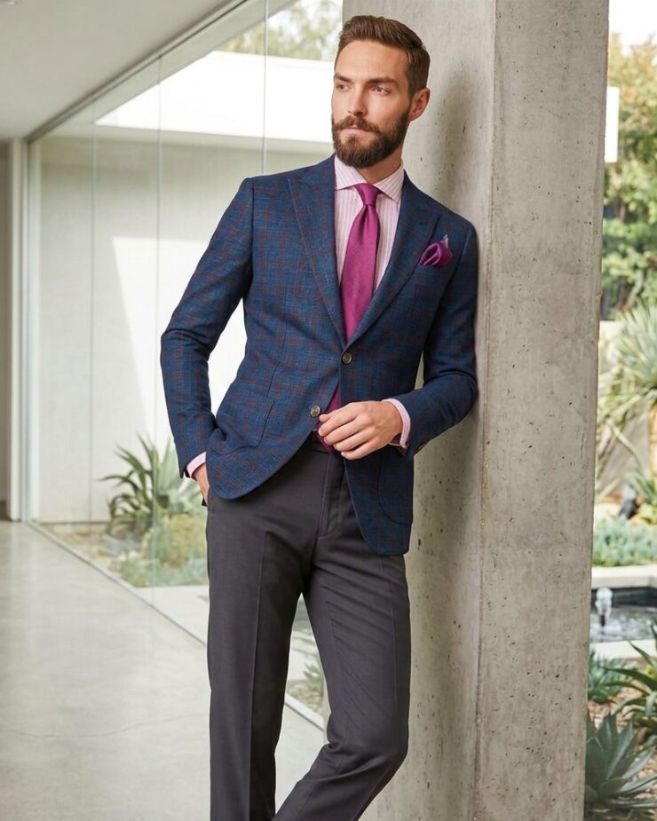 This is the moment we start holding each other’s hands. Happy married life, my love! What an incredible moment in your life, and don’t you want to make it more special with a tailored wedding suit? Try this linen, silk, and wool blend fabric in blue with red window pane checks! Perfect for a spring wedding featuring sleek blazers, contrasting separate pairs of trousers in charcoal gray, and the alluring magenta pink neckties and pocket squares.