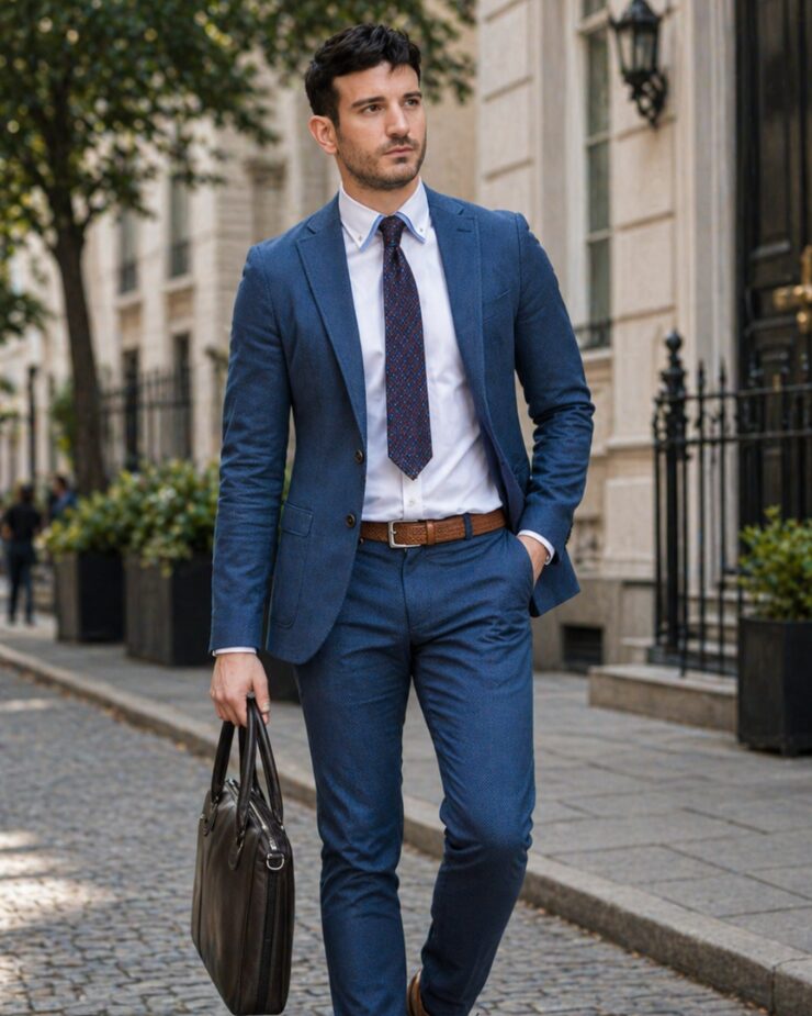 Neither the conventional navy blue suit nor the light blue spring suit is fresh and new. Try this crystal teal blue suit with two pieces! They are solid, chic, and structured for a perfect formal look. The ensemble features a single-breasted, slightly canvassed blazer with notch lapels and front pockets; a matching pair of trim-fit trousers; a contrasting white dress shirt; and a purplish solid necktie. Not much detailing, just a different color tone for a different style!
