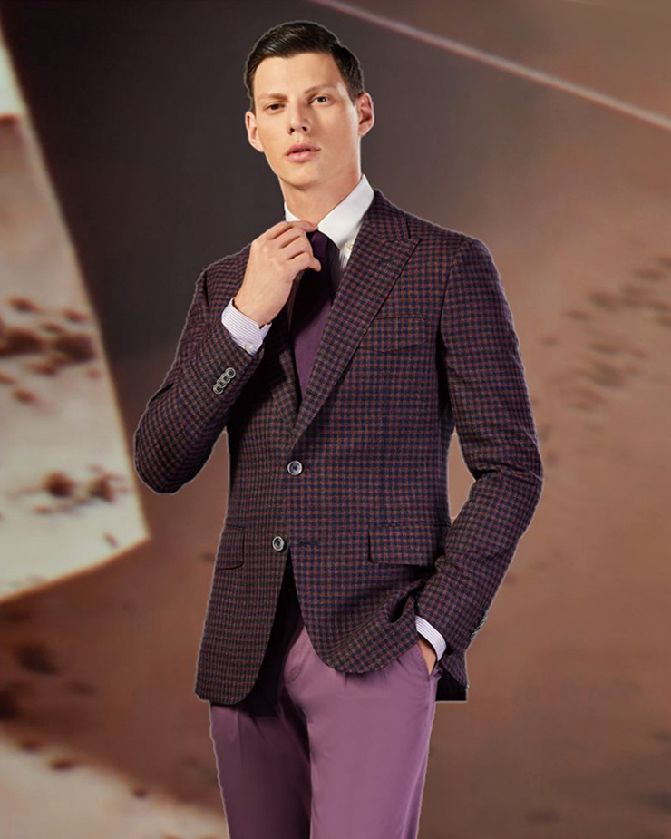 Gingham checks might look old-fashioned, but old is timeless. Show your love in a vintage gingham checkered suit in navy and maroon. The model has coupled it with cotton-made medium orchid-toned solid trousers. The buttoned-down shirt features a contrasting collar and a pink-striped torso. The necktie is solid in fandango pink and complements the blazers and trouser separates. Drop in the comments the right accessories for this timeless suit style.