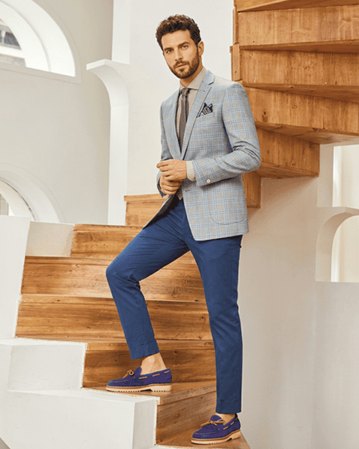 This formal attire features a plaid blazer in gray with light blue checks, a pair of contrasting cotton trousers in blue with a slim fit, a beige or light taupe-hued lightweight dress shirt, and a matching or contrasting solid necktie. Wearing a pair of blue loafers and pocket squares completes this chic professional look in no time. Everything is mixed and matched; nothing new. Hit the thumbs up if you like this attire!